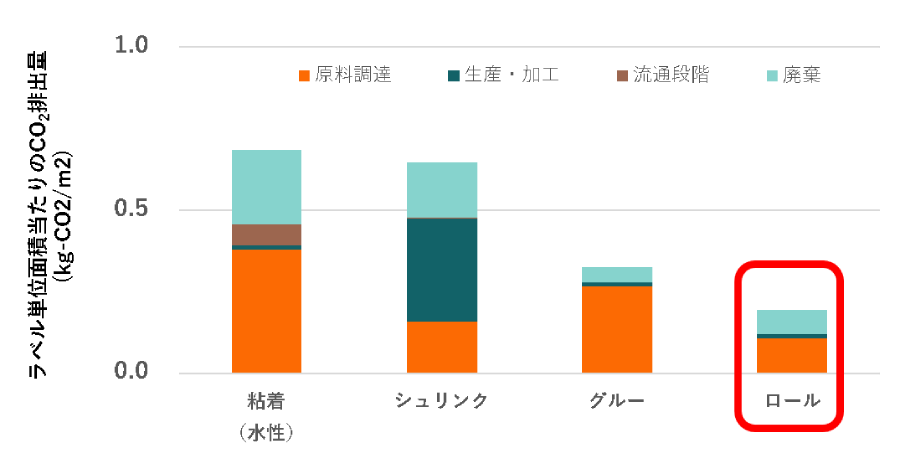 In addition, roll labels have lower CO2 emissions due to the lack of release paper and thin labels, which can reduce the carbon footprint by about 70% compared to self-adhesive and shrink labels (* 1). In terms of raw material costs, roll labels can reduce costs by about 85% compared to self-adhesive labels by eliminating the need for release paper, and thin films can lead to cost savings of about 40% compared to shrink labels (* 2).