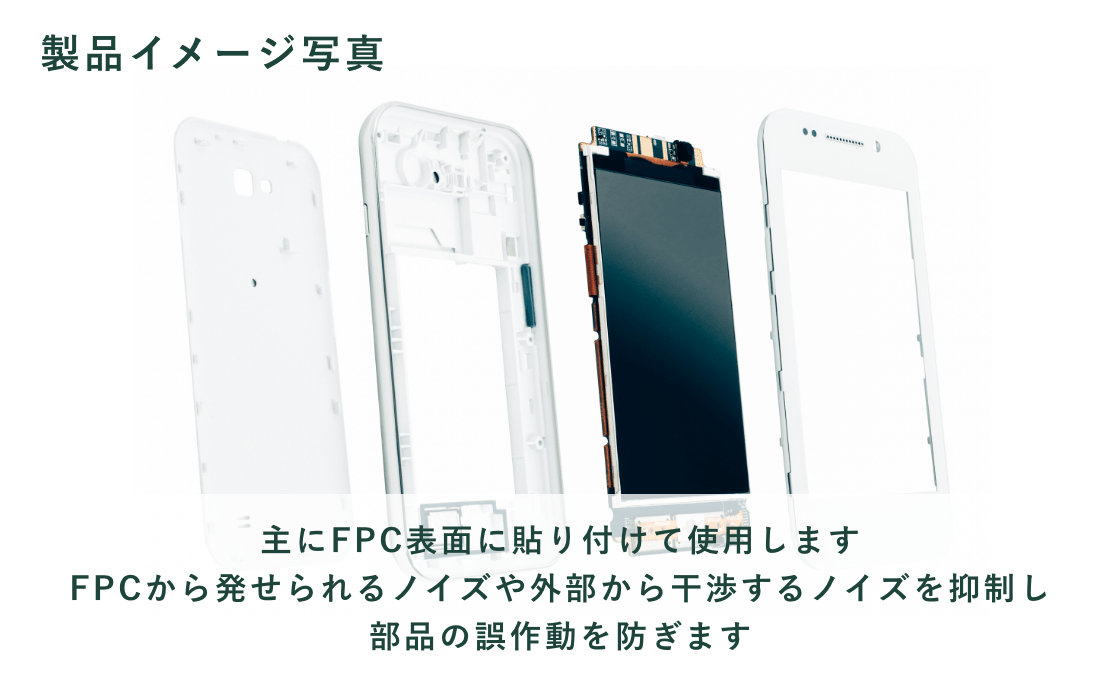 スマートフォンなどの電子デバイスは、小さな機器の中にFlexible printed circuits(※以下FPC)と呼ばれる薄い絶縁材料を使った、曲げることができる構造のプリント基板が幾重にも重なって構成されています。電磁波シールドフィルムは、いくつもの基盤が干渉し合い誤作動を起こす原因となるノイズを抑制するためのフィルムです。