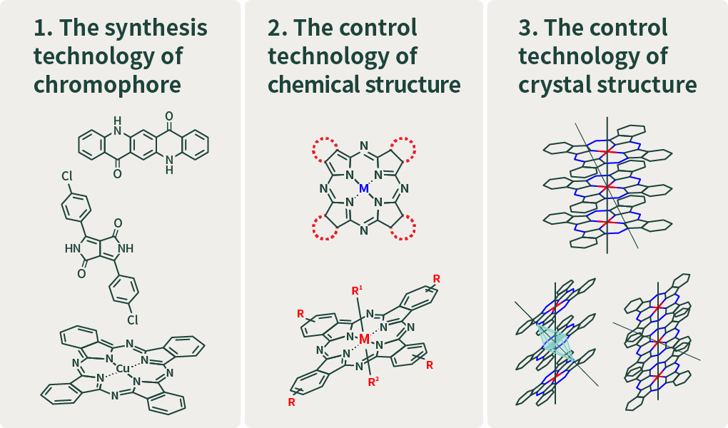 色材設計技術とは、用途に応じて必要な色や特性を発現させるために、分子構造や結晶構造をコントロールして最適な色材をつくりだす技術です。