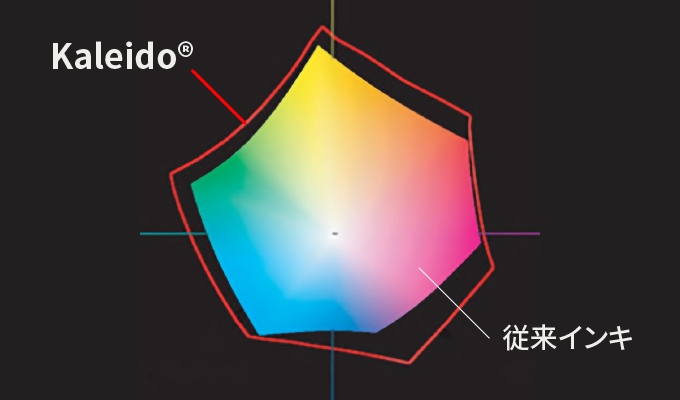 通常印刷物は4色で再現されており、表現できない色は特色と呼ばれる専用の色を用いる必要があります。私たちが開発した広演色プロセスインキ「Kaleido®」は、特色を用いずにディスプレイで見たような鮮やかな色彩を4色で再現できるため、デザイナーやクリエイターの高い要望に応えることができます。